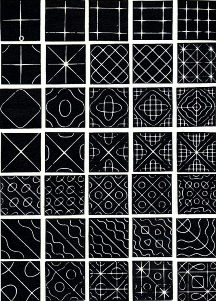 Harmonic patterns formed using different frequencies on a soundboard. They share deep similarities because the equations governing them have the same pattern or shape.